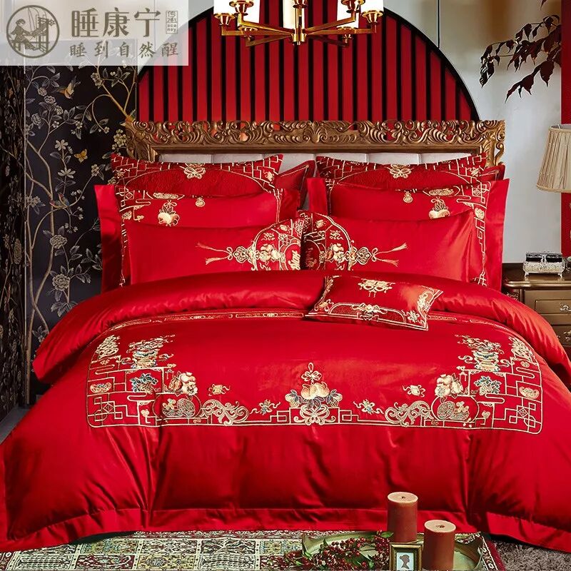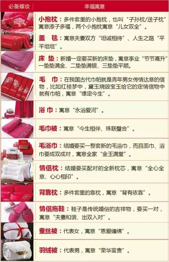 中国红是中国人结婚必须的颜色,结婚当天一定需要铺一套红色的床品,即镇宅也象征新人从此红红火火幸福美满。